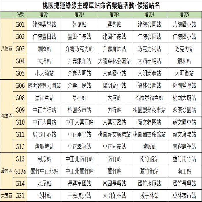 至於第二階段站名票選活動,桃園市政府捷運工程局宣布從6月11日至6月24日舉行,為期14天期間,採取線上投票(活動網址:https://greenlineivoting.tycg.gov.tw),每人每天皆可參加一次活動,每天可針對單一或多個想要命名的車站進行投票。此外,為鼓勵民眾多加參與,投票次數越多,中獎機會也越高;參加者如有桃園市民卡,輸入市民卡號還可額外加乘提高中獎機率,請市民朋友多加把握機會。