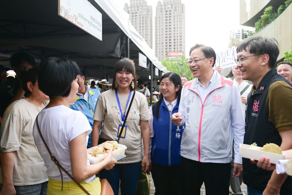 【記者鍾陽正桃園報導】桃園市長張善政日前在市議員李柏坊、陳美梅、市府觀旅局長周柏吟、桃園區長許敏松、歐洲在臺商務協會執行長何飛逸、人間福報社長釋妙熙(妙熙法師)、本植健康生活協會理事長余金龍、國際扶輪台灣蔬食聯誼會執行長高秀忠、台北市仙饌扶輪社前社長鄭旭高、無肉市集創辦人張芷睿等人陪同下,前往桃園藝文廣場出席「植感桃園-植人聚美食祭蔬食市集」。