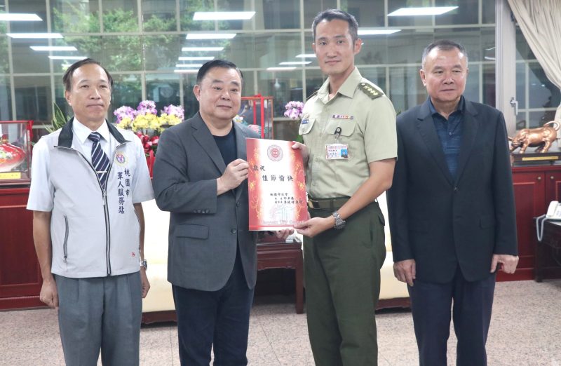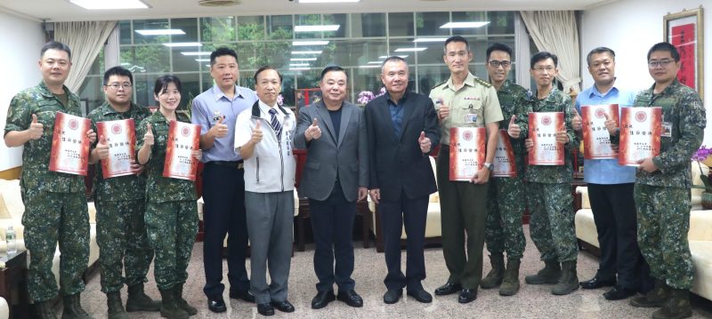 在桃園市軍人服務站站長房明德引領下,來自9個駐守桃園的受贈軍方單位,包括陸軍第六軍團指揮部、陸軍特種作戰指揮部、陸軍航空第六Ο一旅、陸軍飛彈光電基地勤務廠、海巡署北部分署、陸軍步兵第一Ο九旅、憲兵指揮部桃園憲兵隊、陸軍第六軍團五三工兵群及國防部軍事安全總隊桃園工作組等,均派代表前來議會受贈加菜金。
