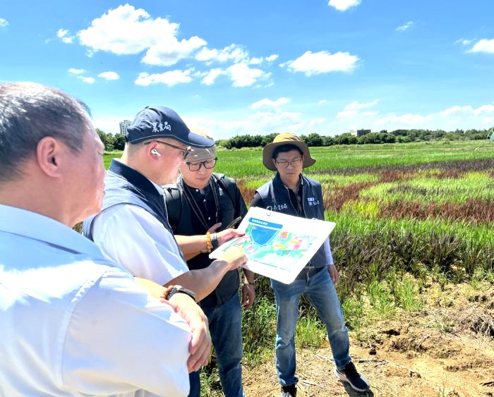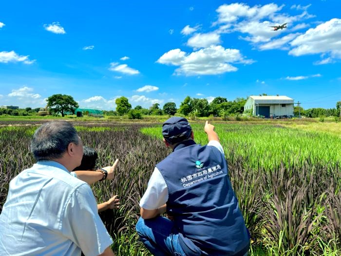 桃園市政府農業局長陳冠義與大園區區長余誌松前往溪海休閒農業區進行「2024溪海花卉農遊趣-秋季展區」的現地會勘,視察目前彩稻的生長狀況。