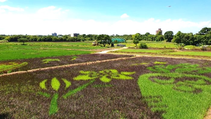 以5種顏色的彩稻品種,也克服很多技術上的困難,以「田園派對-彩稻慶豐收」為主題,預期將可以看到總面積4公頃,號稱是台灣最大的彩繪稻田!