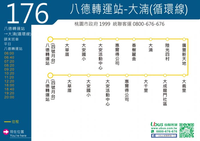 交通局指出,「【176】八德轉運站-大湳(循環線)」試辦期間規劃以1輛甲類大客車提供服務,路線長度為6.2公里,每日12班次(僅平日行駛),該路線為循環線,總營運站位為17站,收費方式同市區公車採里程計費,並適用基北北桃1200月票方案,另持桃園市民卡乘車可享有買一送一優惠,及第2趟優惠18元,歡迎民眾多加利用。