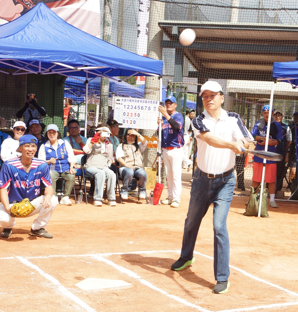 桃園市長張善政揮棒打擊,為桃園市長盃慢速壘球賽啟動儀式。(記者徐玉英攝)