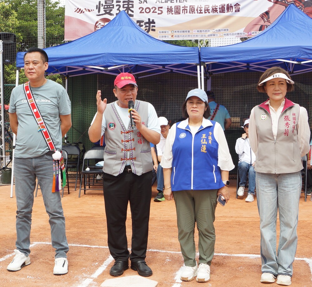 桃園市議員王仙蓮(右二)、楊進福(左二)、張秀菊(右一)、林志強(左一)等人出席「桃園市原住民族運動會全國慢速壘球市長盃錦標賽」。(記者徐玉英攝)