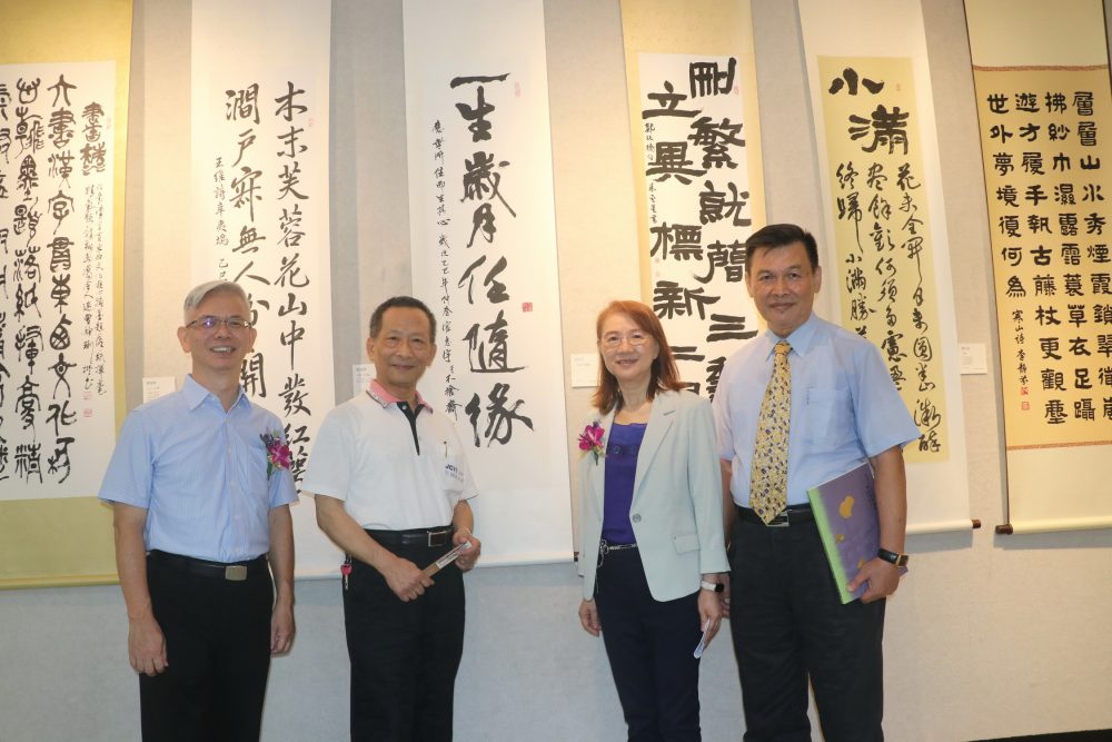 中華書道學會理事長郭彩萍(中右)與台北市中國畫學研究會理事長官志宇(中左)在其展出作品合影。(記者鍾陽正攝)