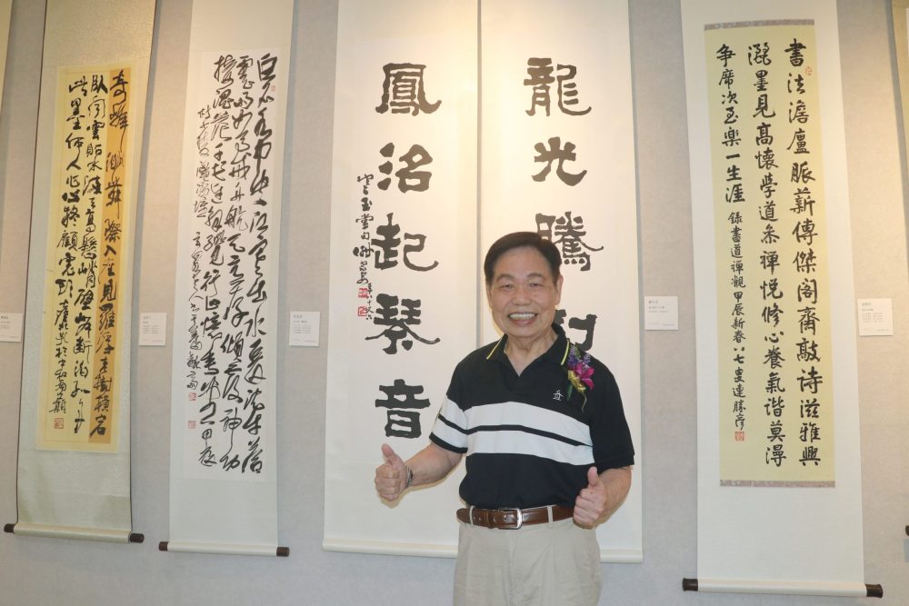 桃園市書法學會理事長榮譽理事長陳綠文在其展出作品合影。(記者鍾陽正攝)