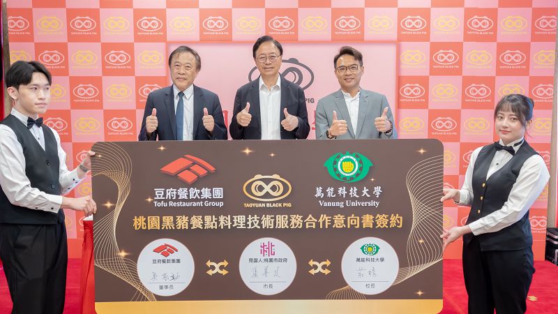 桃園市長張善政現場見證豆府餐飲集團及萬能科技大學簽署「桃園黑豬餐點料理技術服務合作意向書」。