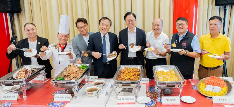 【記者吳惠民桃園報導】桃園市長張善政15日上午在市府農業局長陳冠義、龜山區長張嘉平、萬能科技大學校長莊暢、豆府餐飲集團董事長吳柏勳、桃園市養豬協會理事長林承德、亞都麗緻大飯店天香樓米其林一星主廚路凱源、福容大飯店廚藝總監阿基師等人陪同下,前往臺北圓山飯店出席「桃園黑豬創意餐點行銷活動記者會」。