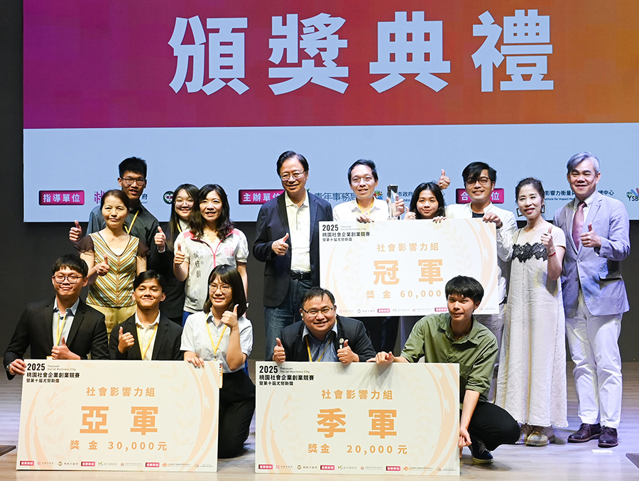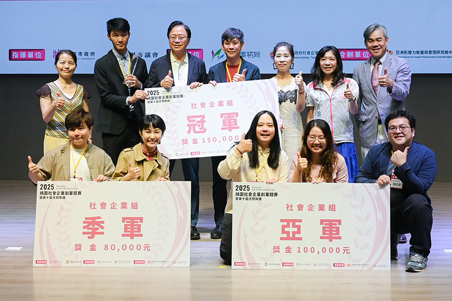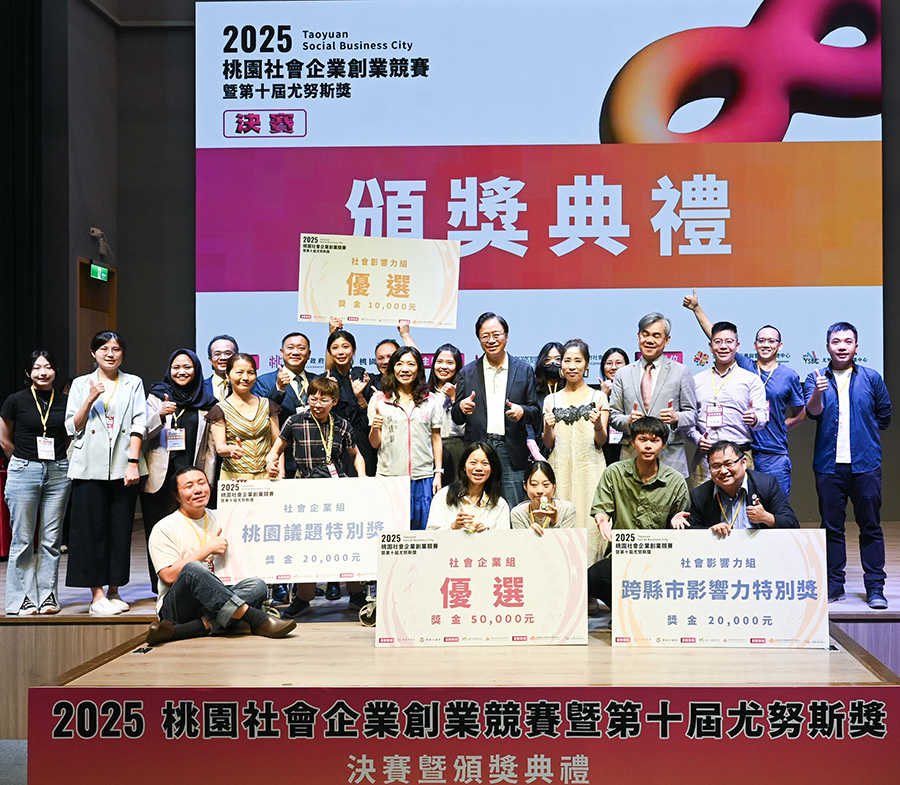 青年事務局表示,2025桃園社會企業創業競賽吸引超過百組團隊報名參賽,經初選與系列專業課程培訓後,共有40組團隊進入決賽,今日頒發社會企業組與社會影響力組前三名、優選及特別獎,其中社會企業組由「台灣生物循環科技公司」獲得冠軍,社會影響力組則由「女王的呼召」團隊奪冠。
