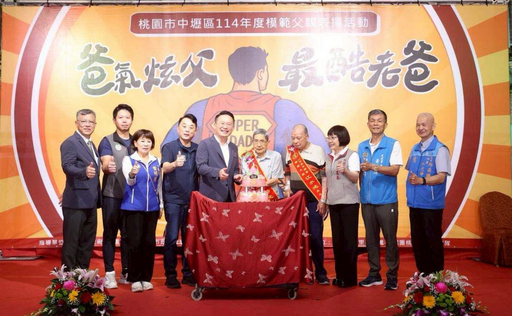 【記者鍾陽正桃園報導】桃園市區公所於日前在中壢區綠光花園舉辦「桃園市中壢區114年度模範父親表揚活動」,由副市長蘇俊賓表揚來自各界推選出的79位父親楷模,並特別與100歲及95歲模範父親代表一同切下象徵敬意與祝福的蛋糕,亦親自頒贈表揚獎座,肯定模範父親們在家庭與社會的付出與貢獻,並祝福爸爸們父親節快樂、健康平安,場面溫馨感人。立法委員魯明哲、市議員葉明月、劉曾玉春、彭俊豪、黃崇真、市府社會局專門委員羅炤月、中壢區長李日強及桃園市里長聯誼會協會總會長黃連應等均一同出席。
