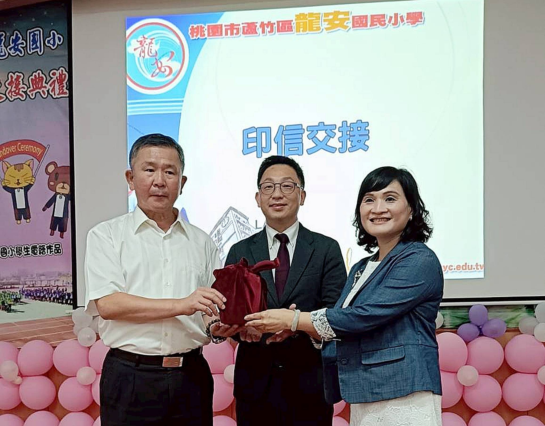 桃園市龍安國民小學四日舉行校長交接典禮,市府教育局由副局長賴銀奎代表主持,在社會局陳寶民局長、桃園市家長會長協會榮譽理長呂朝福、市議員彭俊豪、陳美梅、謝美英和各級學校校長、蔡進福家長會長、地方仕紳與教育界貴賓的見證下,原任校長吳振世光榮卸任,並由新任校長錢善盈接棒,錢善盈以「金馬致詞」風格接棒,引領學校邁向嶄新的四年,典禮氣氛溫馨熱烈。