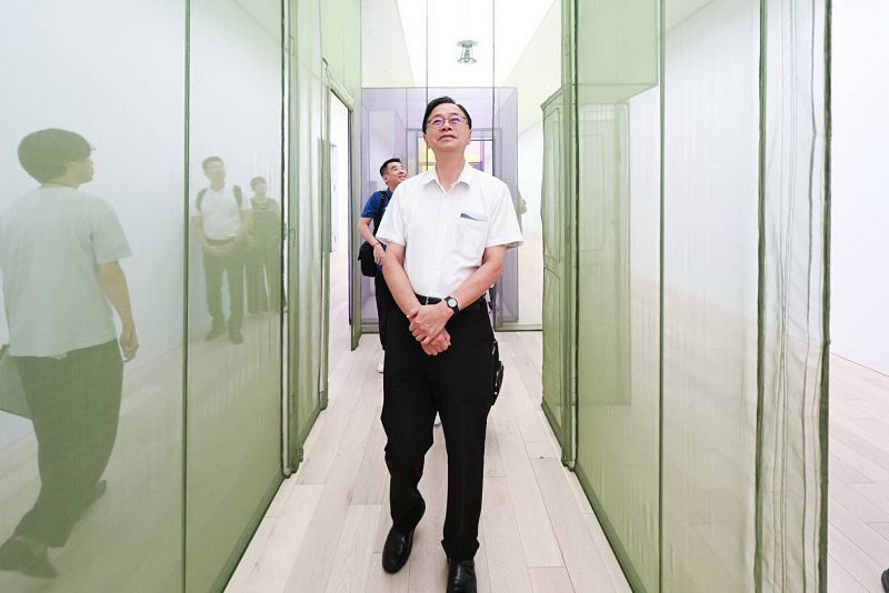 桃園市長張善政參觀直島新美術館,欣賞大型裝置藝術。