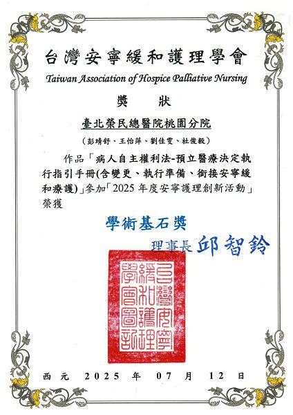 北榮桃園分院指出,該本手冊將陪伴您於重要抉擇時刻,做出最貼近心意的醫療決策,並在符合五大臨床條件時,順利銜接安寧療護,讓每一份善終的心願都能被看見、被尊重並實現。值得欣喜的是,該指引手冊榮獲2025年台灣安寧緩和護理學會「安寧護理創新活動」第三名(學術基石獎)殊榮。
