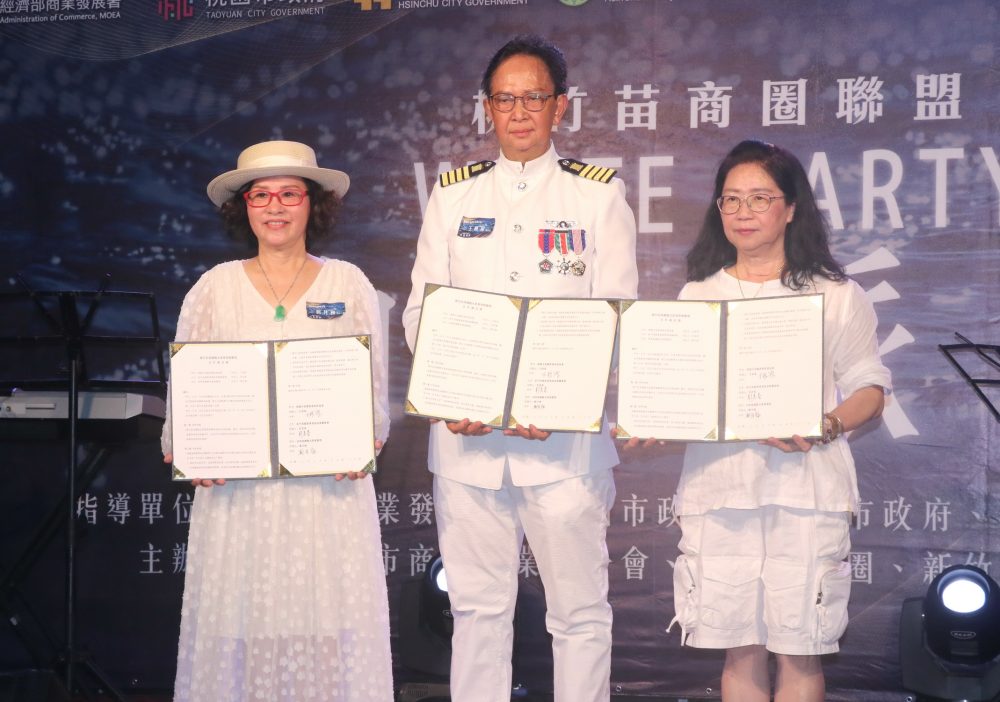 【記者鍾陽正桃園報導】桃園市商圈產業聯合會為促進桃竹苗地區商圈合作與觀光產業聯動發展,於17日晚間在平鎮區忠貞新村文化園區舉辦「白色派對」音樂晚會,並在經濟部商業發展署長蘇文玲與桃園市經發局長張誠的見證下,桃園市商圈產業聯合會總會長王根深與新竹商圈產業聯合會籌備主委彭美善、苗栗商圈產業聯盟召集人劉月梅等三人簽署「桃竹苗商圈聯盟合作備忘錄」,象徵三縣市商圈攜手合作,推動地方產業、觀光與文化發展,攜手共創未來。也邀集桃竹苗三地商圈代表、產官學界人士齊聚一堂,共同見證「桃竹苗商圈聯盟」的正式啟動。