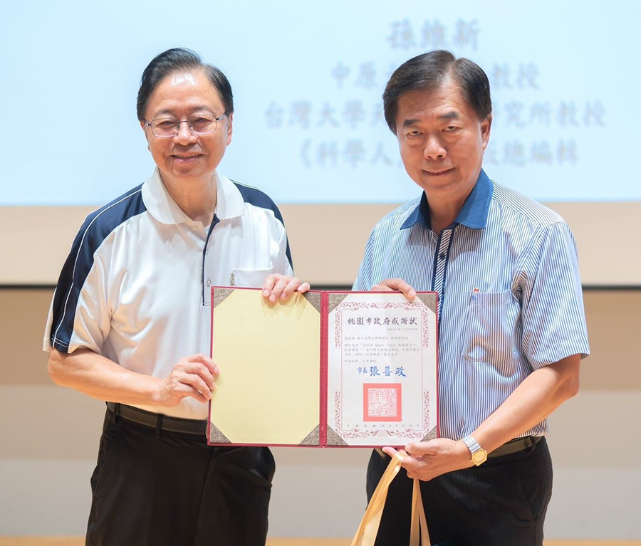 桃園市長張善政頒發感謝狀予中原大學物理系孫維新教授。