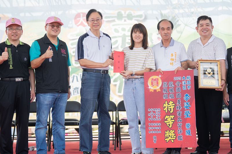 桃園市長張善政(左三)在市府農業局長陳冠義(左二)、市議員李柏坊(右二)等人陪同下,頒發特等獎。