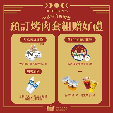 【記者吳世傑桃園報導】今年中秋佳節,中原文創園區將於10月4日(星期六)至5日(星期日)舉辦《中原文創─中秋夯肉俱樂部》烤肉活動。延續去年的熱烈回響,今年活動全面升級!現場還有文創市集、舞台表演、自助卡拉OK機,以及壓軸的抽獎活動,還有100組多項好禮讓民眾帶回家。早鳥優惠於即日起至9月14日止,誠摯邀請民眾一同度過熱鬧團圓的中秋節!