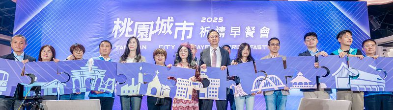 【記者吳艾芸桃園報導】桃園市長張善政13日上午在立法委員萬美玲、涂權吉、市議員黃婉如、陳瑛、王仙蓮、簡志偉、彭俊豪、市府新聞處長羅楚東、婦幼局長杜慈容、環保局副局長葉孟芬、民政局專門委員游建盛、桃園區副區長邱創正、大桃園基督教聯盟主席韓慧蕙、靈糧全球使徒性網絡主席周神助、中華福音神學院院長戴繼宗、基督教文化交流協會魏悌香、中壢靈糧堂主任牧師林宏濱、中華化工董事長甘文元、台灣永光化學工業公司總經理陳偉望等人陪同下,前往桃園區出席「大桃園基督教聯盟2025年桃園城市祈禱早餐會」。