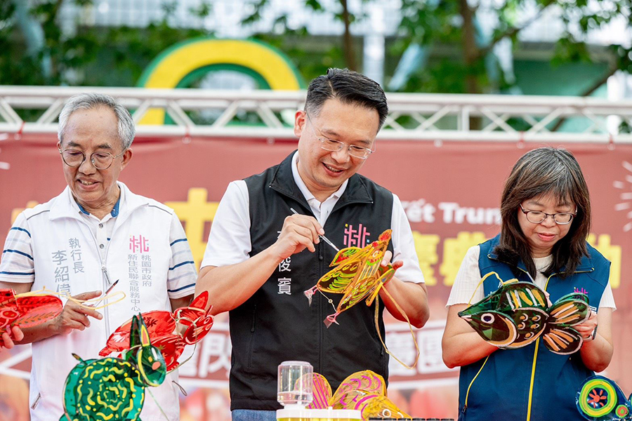 蘇俊賓指出,台灣與越南文化「同中有異、異中有同」,非常有趣。例如生肖僅一處不同,台灣以兔子入列,越南則為貓;但兩地同樣崇拜龍,象徵力量與吉祥。蘇俊賓也以桃園觀音產蓮花,而越南的國花是蓮花,戲稱或許這是越南人首選桃園的主要理由。未來市府推動教育時,除鼓勵新住民子女熟悉國語、台語與母語外,也希望在校園中增加多國文化的體驗課程,讓更多台灣孩子了解越南文化、新住民文化,培養多元文化素養與國際視野。活動現場,蘇副市長也與貴賓共同體驗越南中秋傳統的燈籠彩繪,並參觀攤位,品嚐越南美食、觀摩面具彩繪,近距離感受越南文化的熱情與特色。