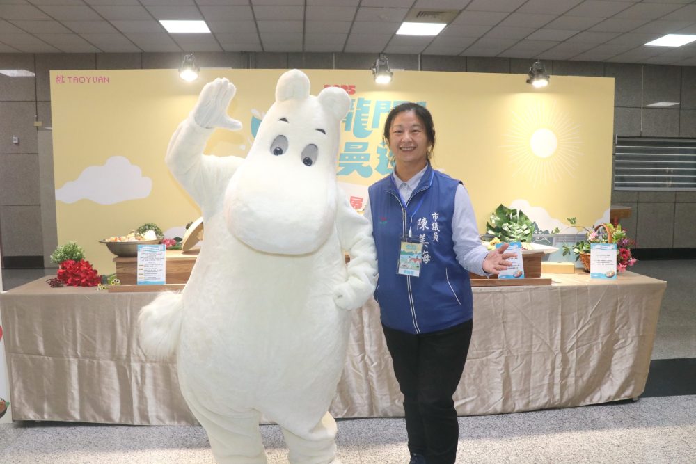 桃園市議員陳美梅與芬蘭國寶級角色「姆明」合影。(記者鍾陽正攝)