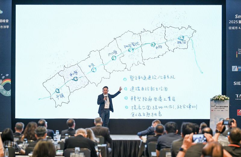 【記者劉國興桃園報導】「Smart2025臺灣永續峰會:從城市4.0到城市淨零」活動日前於台北遠東香格里拉飯店登場,桃園市副市長蘇俊賓受邀出席,以「淨零城市的智慧解方」為題演講,並與德國薩克森邦長Michael Kretschmer及台灣西門子總裁暨執行長張合翕交流。蘇俊賓從桃園人口結構、產業發展、交通建設的趨勢與流動等面向,透過自己全手繪簡報,以圖像敘事方式,清晰呈現桃園邁向淨零城市的挑戰與智慧解方;Michael Kretschmer邦長也分享薩克森邦邁向數位化與去碳化的未來,雙方成功進行了一場城市淨零交流。