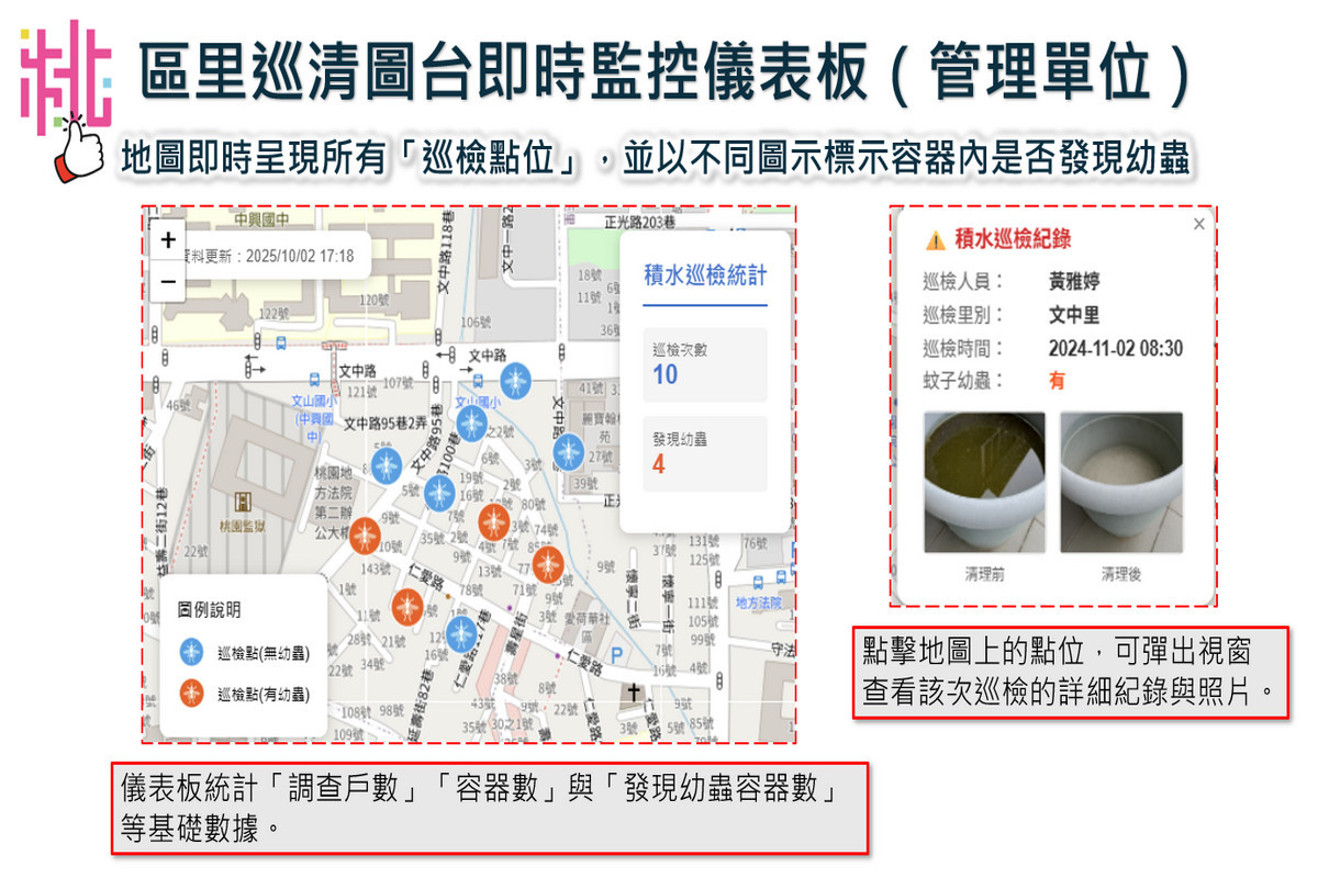 蘆竹區公所也結合水務局、民政局、環保局、衛生局等以「水巡APP」為基礎,開發登革熱巡查新功能,並導入AI科技輔助。透過智慧化工具量化「巡查及清除」成果,讓資訊更透明、更精準,協助社區掌握防治效能並提升資源運用效率。巡查人員可利用行動裝置上傳現場照片與紀錄,系統即時判斷定位,協助快速回報。此舉不僅提高巡查效率,更建立「人力巡查 + 科技監測」的新型防疫模式,簡易的輸入獲得高效的成果,會中引起熱烈迴響。