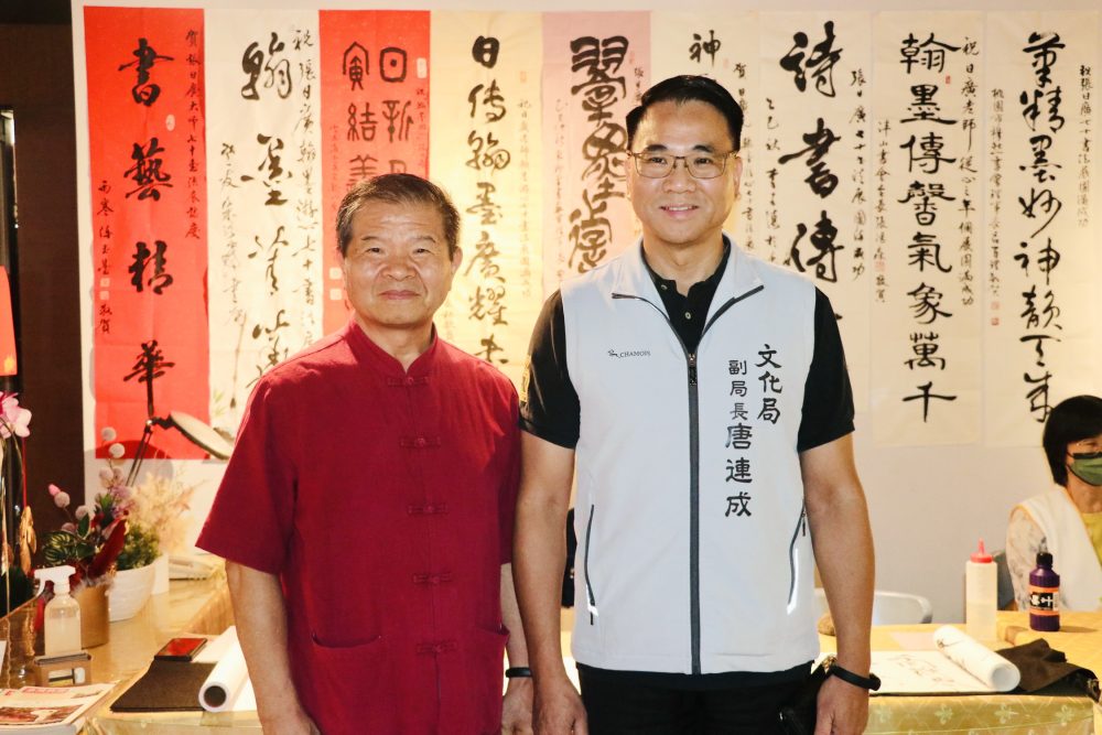 桃市府文化局副局長唐連成(右)參觀張日廣(左)書法個展。(記者鍾陽正攝)