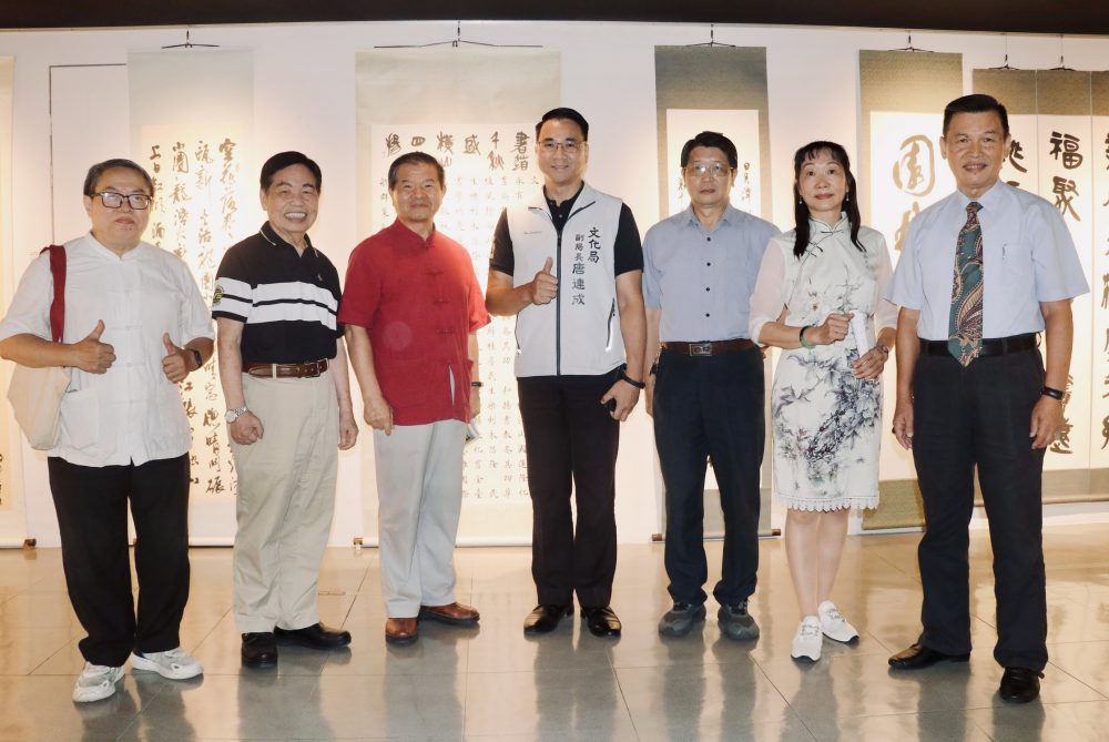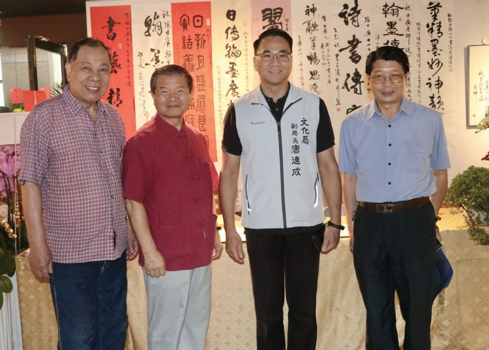 中華國際藝術交流協會理事長孔憲中(右1)參觀張日廣(左2)書法個展。(記者鍾陽正攝)