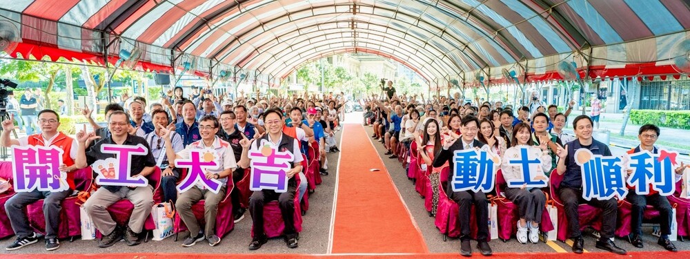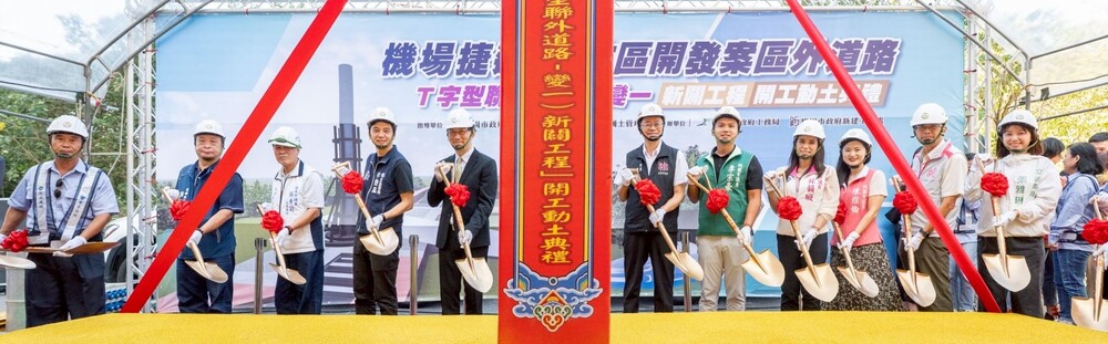 桃園市長張善政16日上午在立法委員牛煦庭、張雅琳、市議員孫韻璇、陳雅倫、李宗豪、內政部政務次長董建宏、內政部國土管理署組長王武聰、市府工務局長汪在宙、新建工程處長呂紹霖、文化局專門委員董俊仁、龜山區長張嘉平、茂成建設公司負責人呂理雄、世合工程技術顧問公司副總經理張增糴等前往龜山區,出席「機場捷運A7站區開發案區外道路(T字型聯外道路-變一)新闢工程」開工動土典禮。
