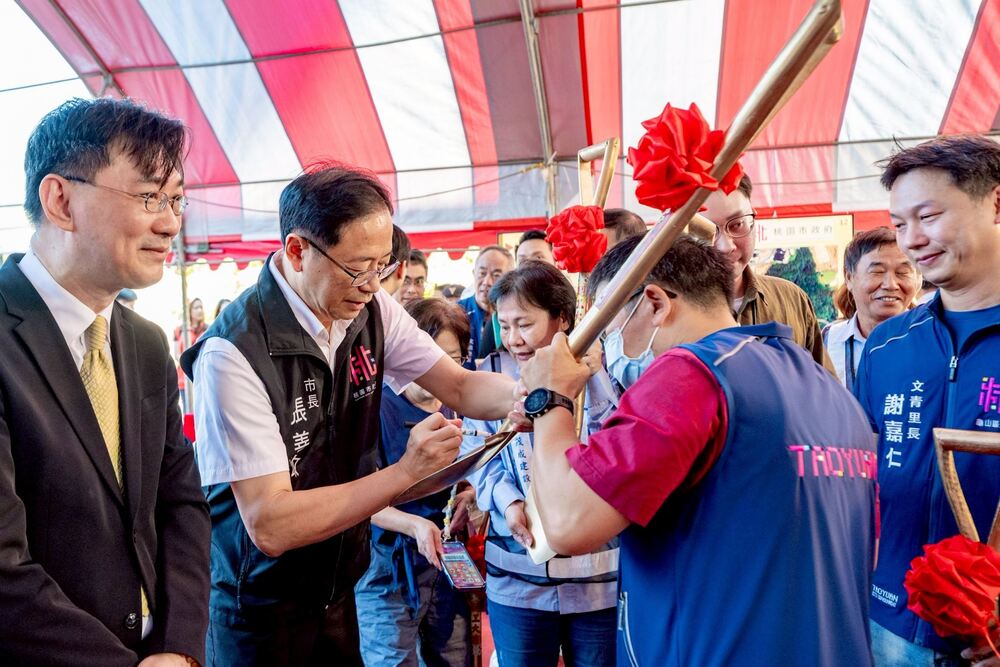 桃園市長張善政於動土剷子上簽名。