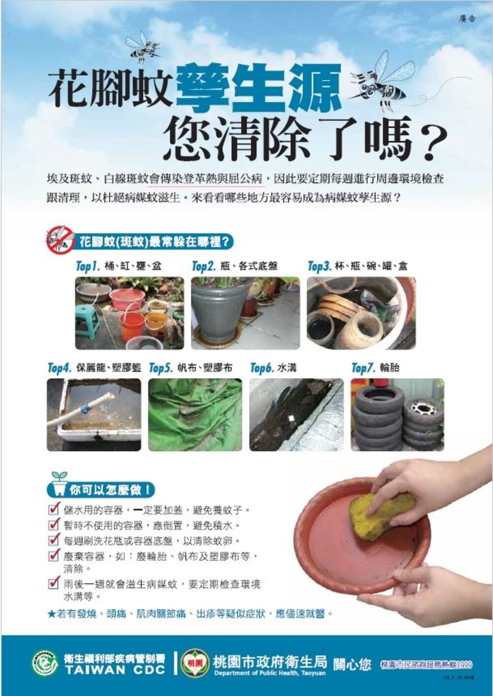 衛生局再次強調,自9月28日本土登革熱疫情開始,市府各局處動員超過2,000餘人次,清除1萬7,458個積水容器,市民應每週至少一次檢視居家與戶外環境,落實「巡查、倒水、清除、刷洗」四步驟,徹底清除病媒蚊孳生源。對於未落實孳清經查獲者,將依《傳染病防治法》規定裁處,最高可處新臺幣1萬5,000元罰鍰。此外,登革熱症狀包含發燒、頭痛、後眼窩痛、關節肌肉疼痛及出疹等,若有疑似症狀,應及早就醫,並主動告知旅遊史或活動地點,以利診斷與防治。相關登革熱NS1快篩合約院所名單可至桃園市政府衛生局網站查詢(https://reurl.cc/pYoVxd)。民眾如有防疫疑問,可至衛生局官網(http://dph.tycg.gov.tw/)或撥打24小時防疫專線:0800-033-355。