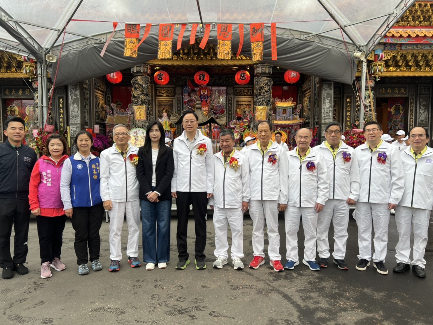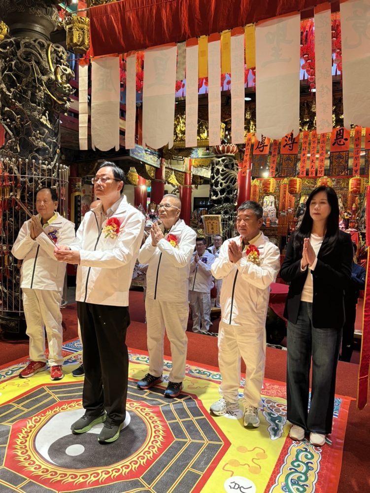系列活動昨日進行「圓醮起功」儀式,市長張善政在民政局副局長藍品俊、區長許松等人陪同下,上午七時時抵達慈護宮廟埕,受到主委簡征潭、建醮主委林建龍暨許多信眾熱烈歡迎,到場參與「圓醮起功」還有立委萬美玲、市議員陳美梅等人,起功祭典儀式結束後,大家並一起拍照留念。