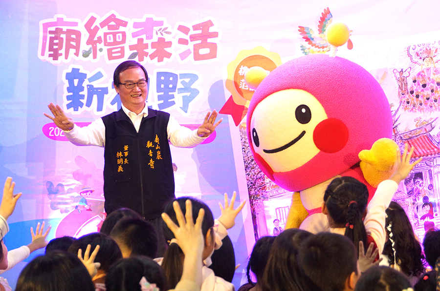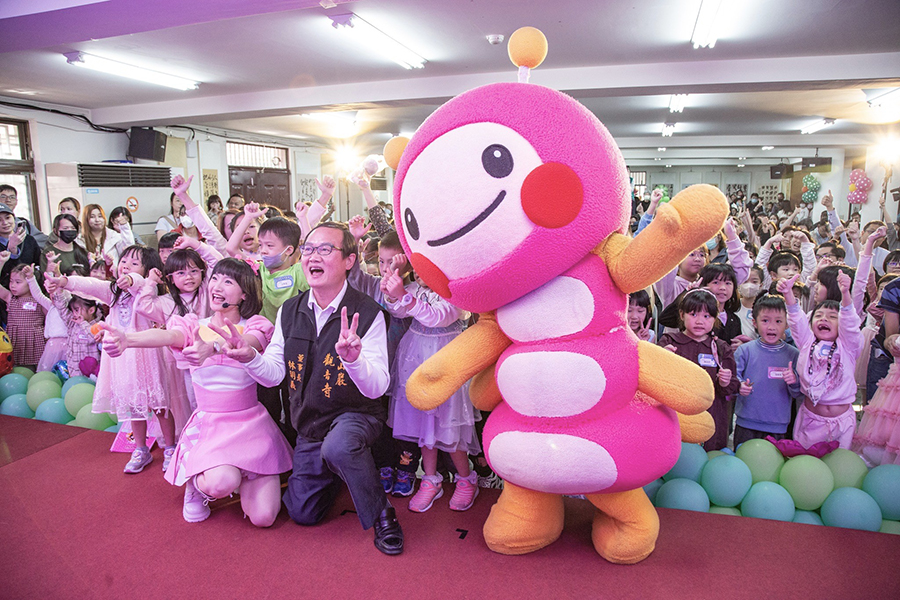 壽山巖觀音寺董事長林明義與MOMO家族在舞台上與小朋友們一起唱唱跳跳、熱鬧開場。(圖:記者徐玉英攝)