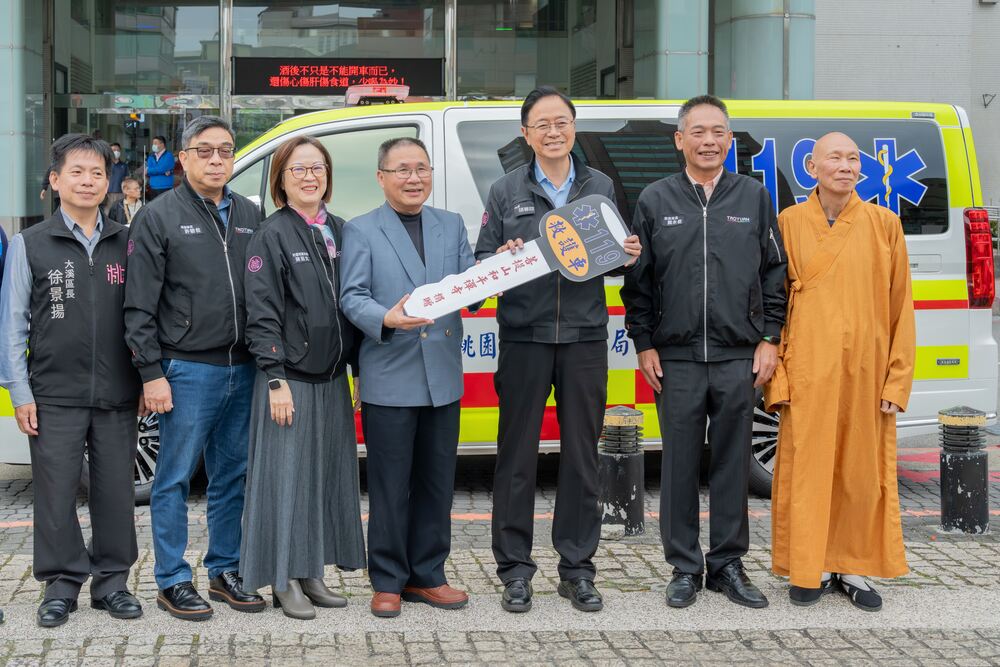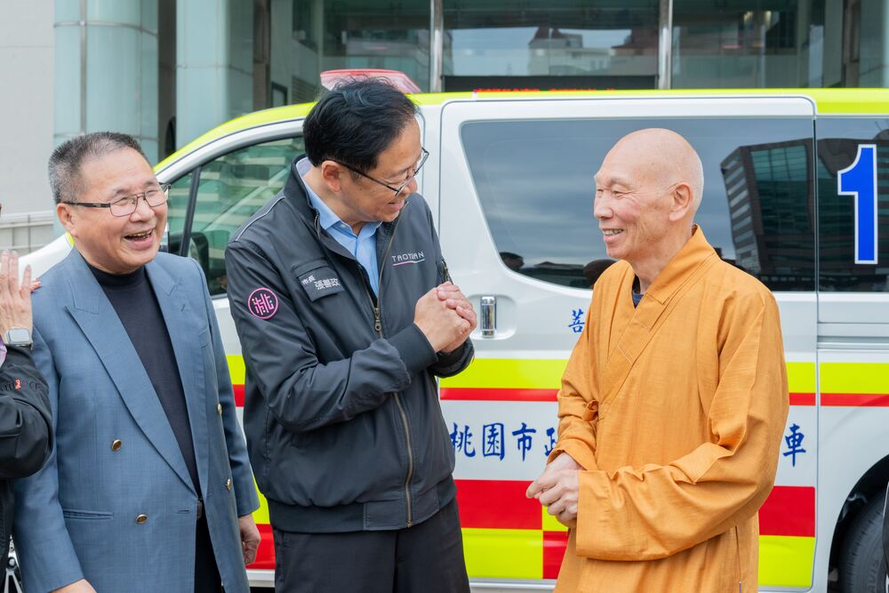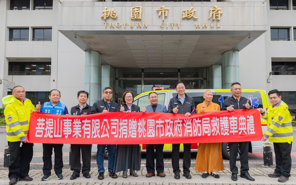 【記者吳艾芸桃園報導】桃園市長張善政日前在市府消防局長龔永信、社會局副局長陳茹文、桃園區長許敏松、大溪區長徐景揚、菩提山事業有限公司釋宗皇法師及市政顧問曾榮鑑等人陪下,於市府前廣場出席「菩提山事業有限公司捐贈桃市府消防局救護車儀式」,接受菩提山事業有限公司捐贈救護車一輛及社會救助金130萬元,並回贈感謝狀及救護車模型,感謝該公司熱心公益,充實本市緊急救護及社會救助能量。