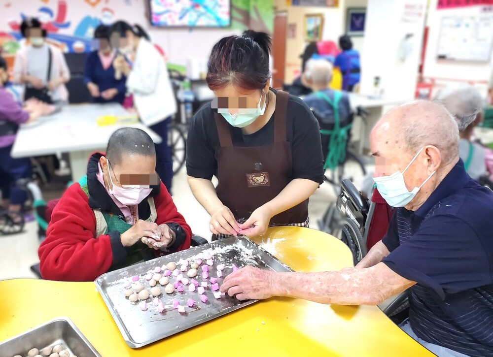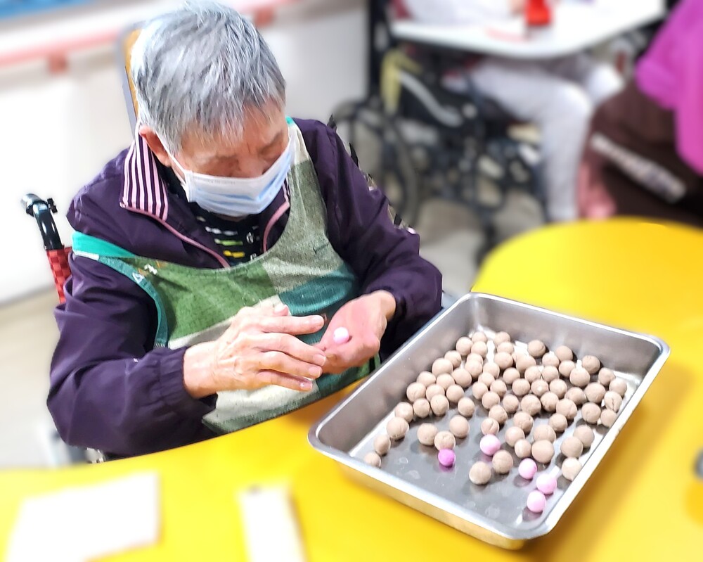 松柏園護理之家長輩開心搓著五彩湯圓,雙手忙碌、笑意滿溢,手作時光溫馨愉悅。