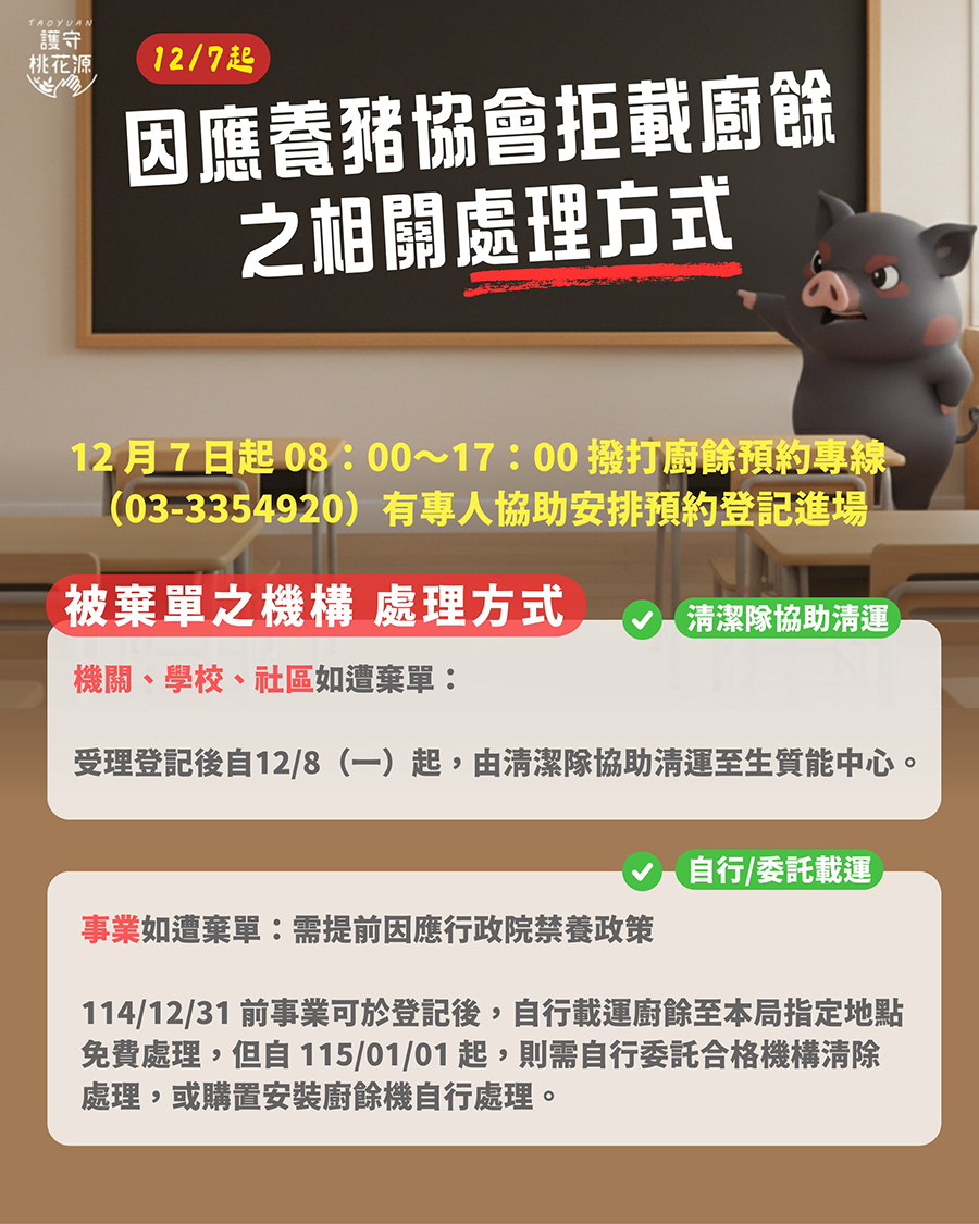 環保局長顏己喨指出,自 110 年 11 月起,清潔隊所收取的家戶與社區廚餘已全面停止用於餵養豬隻。這些廚餘主要送往生質能中心進行厭氧處理發電,或委託民間機構採快速醱酵製成肥料;至於學校、餐飲及團膳等事業廚餘,過去多由豬農載回養豬場處理,但近期因拒收串連,已造成部分學校與業者面臨清運困擾。為協助學校、社區與事業單位度過這波衝擊, 環保局設有廚餘預約專線(03-3354920),由專人於上午 8 時至下午 5 時受理,協助確認進場時段與清運調度,避免大量車輛同時湧入造成混亂。同時,若學校、機關或社區遭遇豬農拒載,只需完成電話登記,清潔隊將立即接手清運並協助處理。
