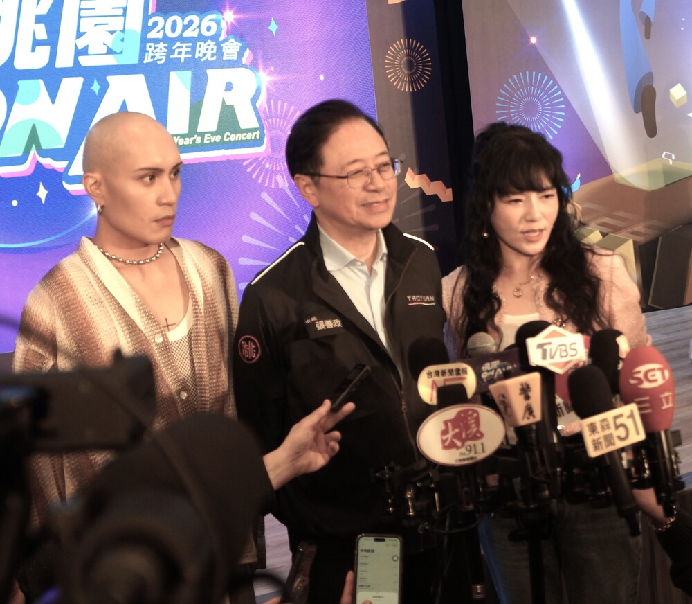【記者徐玉英桃園報導】桃園市長張善政日前在市府觀旅局長陳靜芳、新聞處長羅楚東、捷運工程局主秘楊曜華、桃園觀光發展基金會副執行長陳信守、桃園區副區長邱創正、聯利媒體公司總經理劉文硯、璟都建設公司總經理高林鋒、中華航空公司公共關係室協理郭睦芳等人陪同下,前往市府綜合會議廳,出席「2026桃園 ON AIR 跨年記者會」。