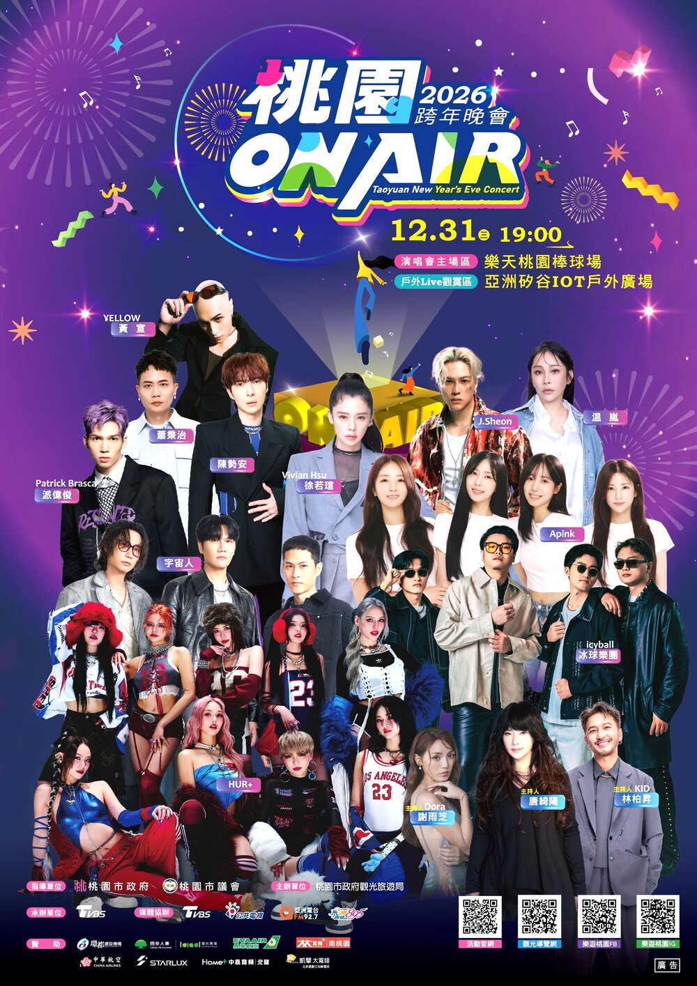 觀旅局補充,此次活動採雙場地辦理,兩處皆設置主題入口意象與拍照點,並可同步欣賞跨年煙火;戶外觀賞區亦規劃「星光美食市集」,現場將免費發放限量跨年專屬「星星發光手環」。此外,今年推出「跨年搖滾區 VIP PASS 抽獎活動」,12 月 15 日至 12 月 21 日至樂遊桃園 FB 完成指定任務即可參加抽獎。更多晚會資訊請至「2026 桃園 ON AIR 跨年晚會」活動官網(網址: https://www.2026taoyuannewyear.com.tw/)及「樂遊桃園 Facebook」官方粉絲專頁查詢。