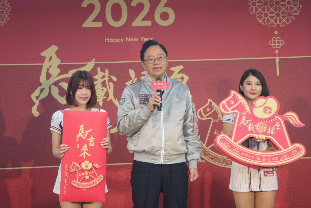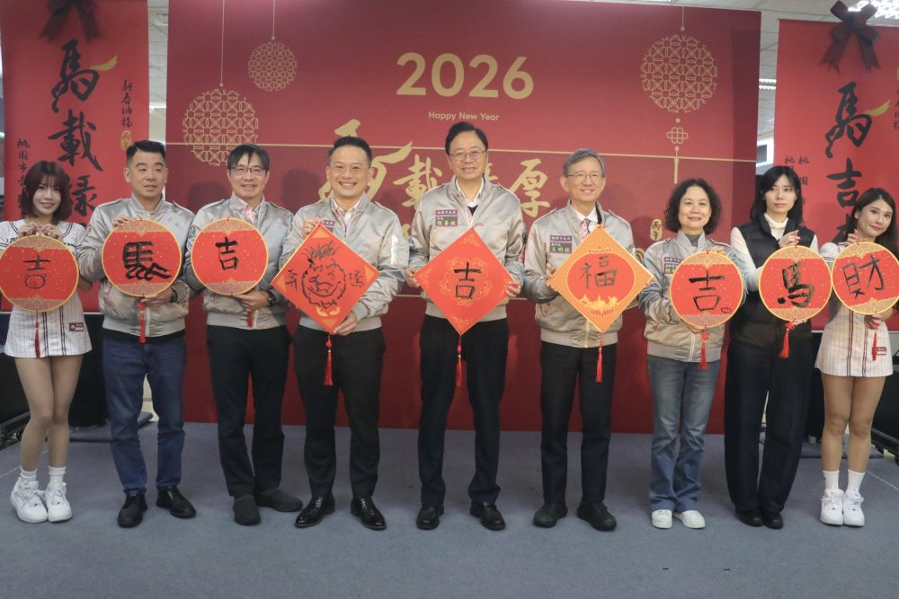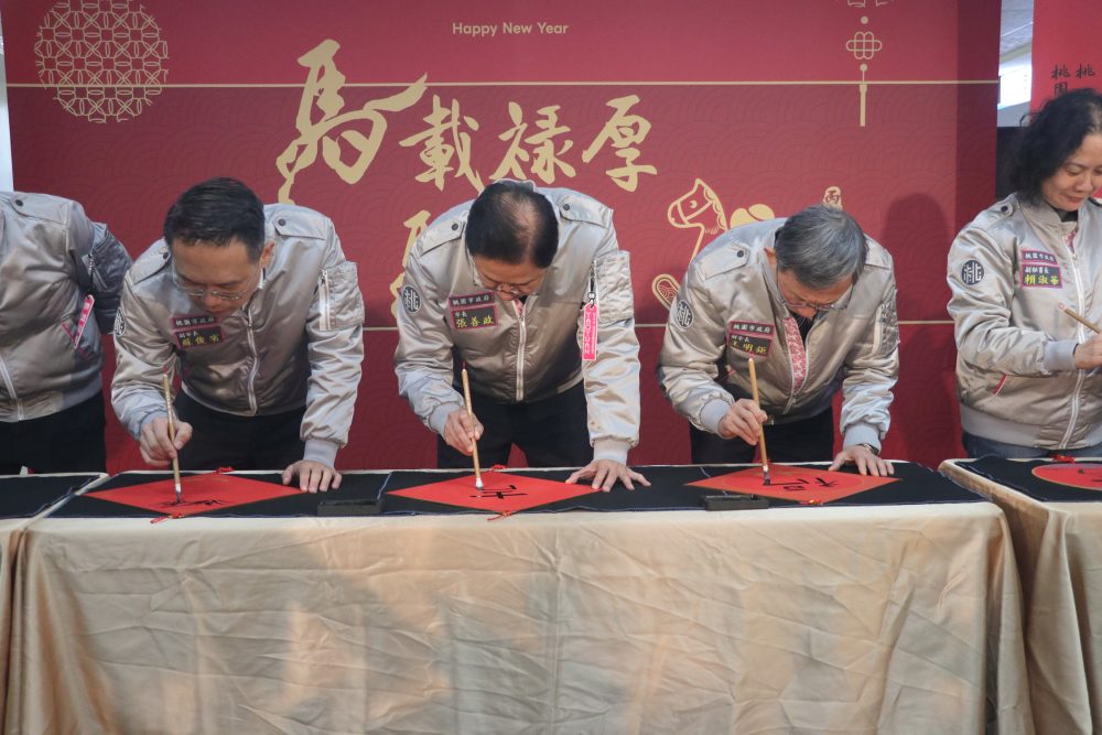 【記者鍾陽正桃園報導】桃園市政府為迎接2026丙午馬年農曆新年到來,於6日上午在市府一樓穿堂舉辦「2026丙午馬年桃園新春春聯、福袋及紅包袋發表會」,由市長張善政與市議會議長邱奕勝、書法藝術家王鈺權、樂天女孩琳妲、熊霓一同展示丙午年「馬載祿厚」、「馬吉來」兩款春聯,以及「元氣搖搖馬」造型福袋、紅包袋,更與副市長蘇俊賓、王明鉅、秘書長溫代欣等府層長官共同動筆揮毫寫下馬年新春祝福,與市民共同分享2026馬年佳節喜氣,並透過新春福品祝福寓意,為桃園新的一年帶來蓬勃生機。市議員陳美梅、林政賢、段樹文均出席。