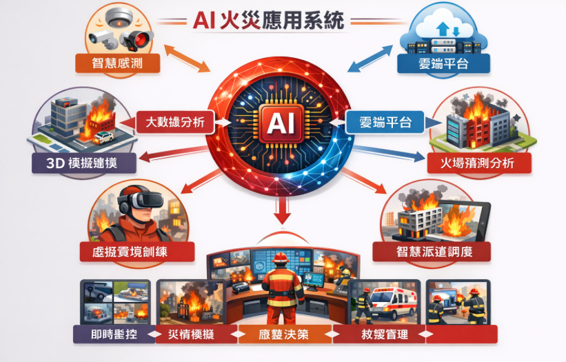 利用 AI 與 3D 建模可建立「數位孿生消防訓練場」,模擬: