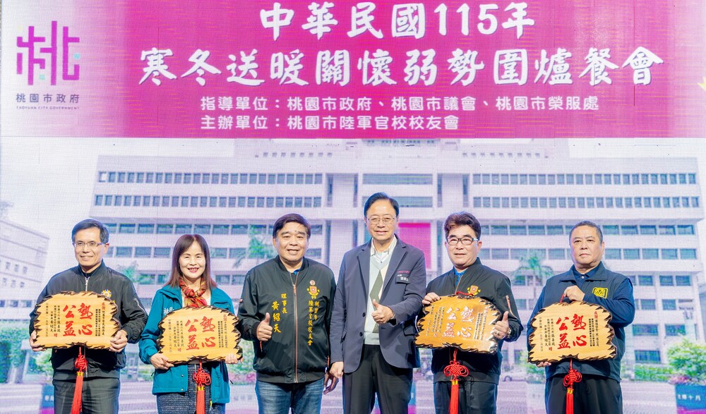 【記者鍾陽正桃園報導】桃園市長張善政5日中午在市議員陳美梅、市府民政局專門委員游建盛、中壢區長李日強、陸軍官校校友會理事長黃紹天、前退輔會主委曾金陵、榮民服務處處長鄭源敏、桃園市退伍軍人協會理事長革安明、慶福慈善基金會執行長吳坤德等人陪同下,前往中壢區出席「115年陸軍官校校友會寒冬送暖關懷弱勢圍爐餐會」。