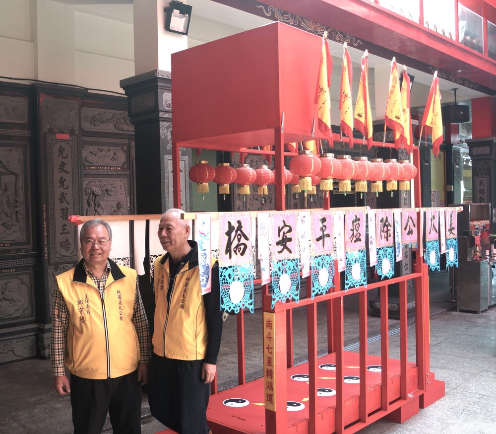 桃園姜太公廟主任委員邱守德(左)及總幹事邱春智(右)介紹春節期間至桃園姜太公廟過「姜太公平安七星橋」,踏斗七星添福祿!(本報檔案資料)