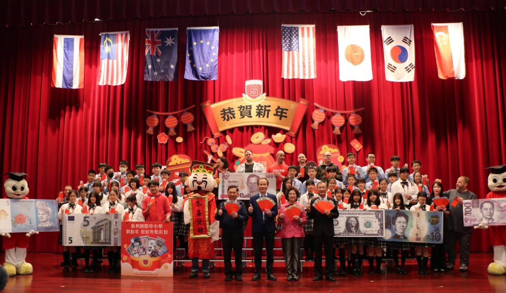 新興國際中小學每年過年後開學都會發給學生外幣紅包,每個人拿到的都是不同國家的外幣,今年發放的外幣計有馬來幣、新加坡幣、澳幣、歐元、泰銖、美金、日幣、韓幣等八種。現場還有外師扮演的財神爺與新興吉祥寶寶一起祝賀新年。同學拿著紅包,臉上充滿幸福的笑容,現場洋溢新春的喜悅與溫馨和諧氣氛。