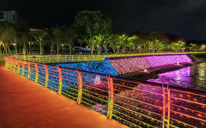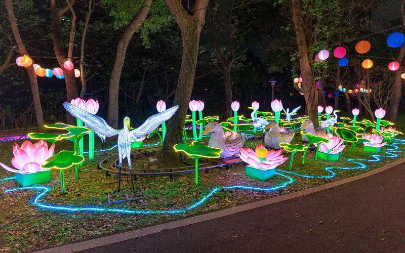 離開科技感,沿著南崁溪水岸漫步,空氣中瀰漫著花草芬芳與繚繞水霧。首先迎接遊客的是會動的白鷺鷥、荷花及鴨子等傳統花燈,在自然旋律中閃動。隨後登場的巨型童趣搖搖馬,瞬間喚醒童年木馬回憶;緊接著進入由光束折射的神祕光廊,讓人彷彿闖入森林仙境。漫步河岸時,還能巧遇成群調皮趴在河畔的可愛河馬燈組,在溪畔傳遞溫馨祝福。