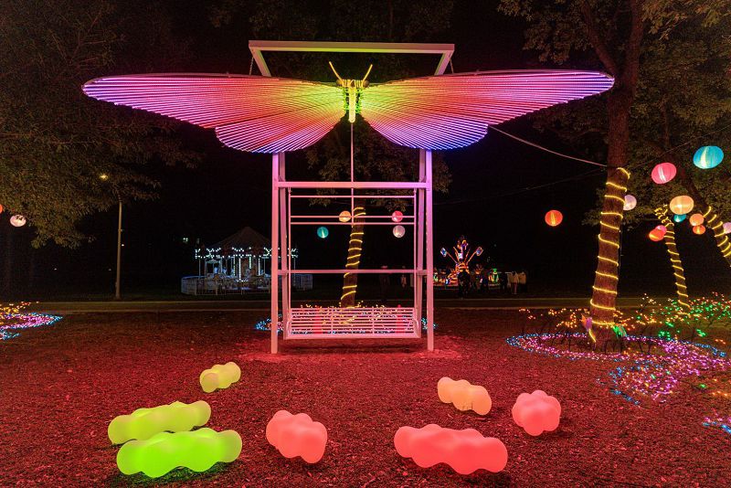 桃園市觀旅局介紹,進入虎頭山創新園區「未來光域」,高13公尺、展翼18公尺的全金屬機械主燈「飛馬耀桃園」威震全場,結合煙霧、雷射與多軸機械運作,展現翱翔天際的氣勢。園區宛如魔幻的未來花園,設有超大蝴蝶翅膀互動鞦韆,更隱藏著科技驚喜:民眾掃描現場QR Code,即可透過AR技術看見空中虛擬裝置,進行「現地美拍」或線上「求籤祈福」。此外,園區內規劃旋轉木馬、海盜船、摩托車、小火車等設施供小朋友免費搭乘,讓賞燈之餘充滿歡笑聲。