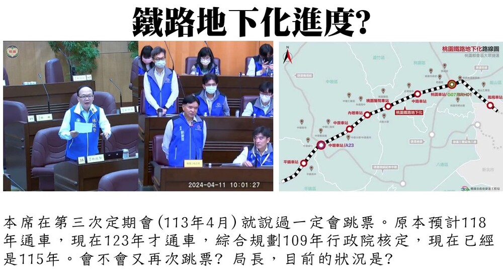 林政賢指出,桃園鐵路地下化工程原預計於民國118年通車,現已修正為民國122年第一階段通車(包含鳳鳴、桃園、內壢、中壢、平鎮站),以及民國123年第二階段通車(中路、桃園醫院、中原站)。他表示,該案早在民國109年即由行政院核定綜合規劃,至今已歷時多年,要求市府應加快推動進度,避免工程持續延宕。