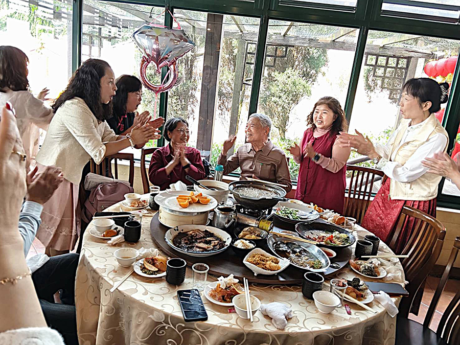 【記者吳惠民、徐玉英桃園報導】名書畫家台藝書畫學會理事長葉蘭香教學之貿易國畫班學生李渝瓊偕同高齡98歲夫婿歐喜勳,日前在其公子歐允中及貿易國畫班師生30多人陪同下,於龍潭山水緣庭園景觀餐廳共同歡慶「鑽石婚」。