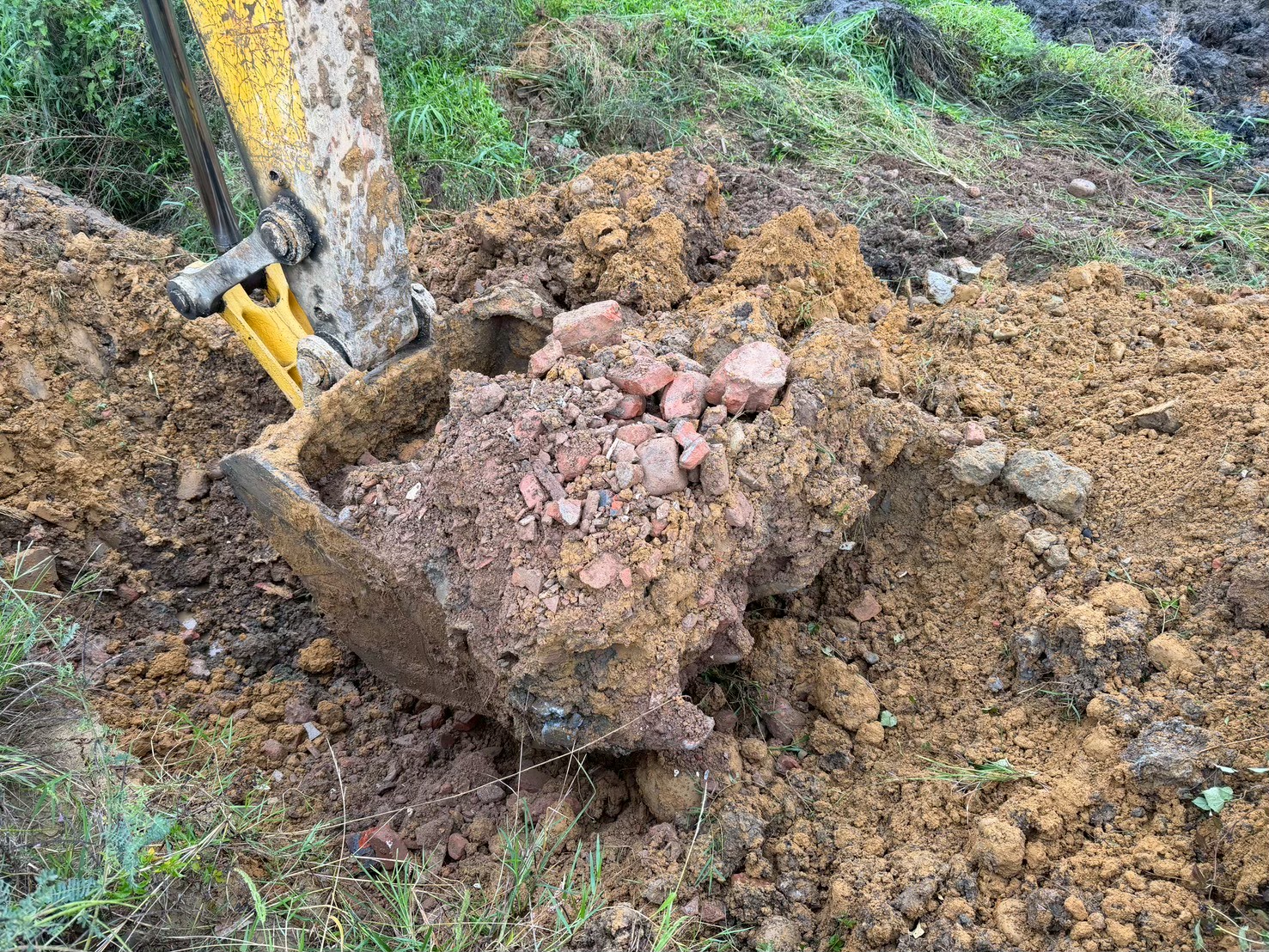 專案小組現場開挖發現大量紅磚、磁磚、鋼筋、電線、木材、廢布及金屬管等營建事業廢棄物。(桃檢署提供)