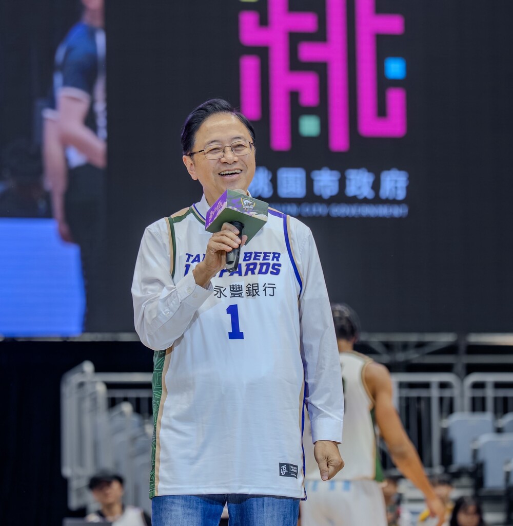 【記者吳艾芸桃園報導】桃園市長張善政日前在市議員陳美梅、市府副秘書長金志聿、體育局長許彥輝、台啤雲豹籃球隊執行長張建偉、雲豹能源科技公司董事長廖福生、總經理趙書閔、天能綠電公司總經理唐亞聖、台普威能源公司總經理馮浩翔等人陪同下,前往桃園區桃園市立綜合體育館出席「2025-26年TPBL職業籃球聯盟桃園台啤永豐雲豹主場例行賽」。